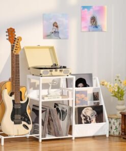 Black End Table, Small Side Table with Metal Frame,Modern Record Player Stand with Storage Shelf, Wood 3 Tier Sofa Bedside Tables, Narrow Nightstand for Living Room Bedroom Office